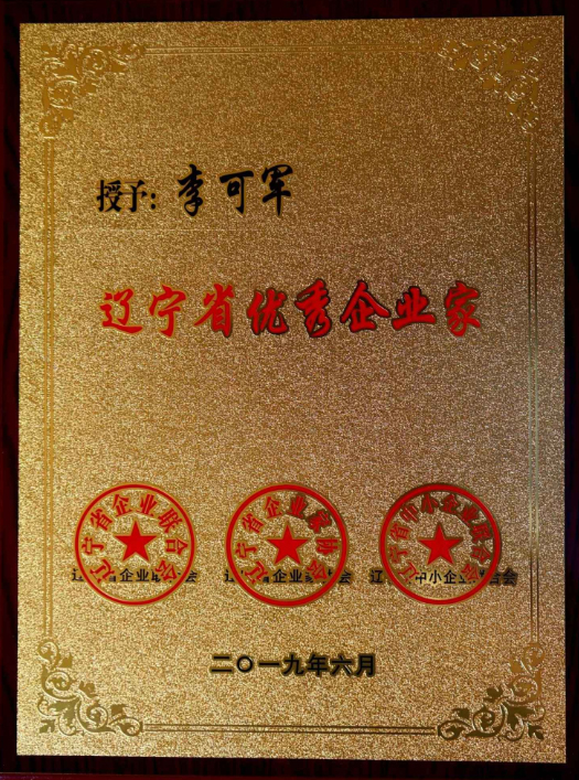 6月20日,在遼寧省企業(yè)聯(lián)合會(huì)、企業(yè)家協(xié)會(huì)第十一次代表大會(huì)上,李可軍董事長(zhǎng)榮獲2018年度“遼寧省優(yōu)秀企業(yè)家”榮譽(yù)稱號(hào)。