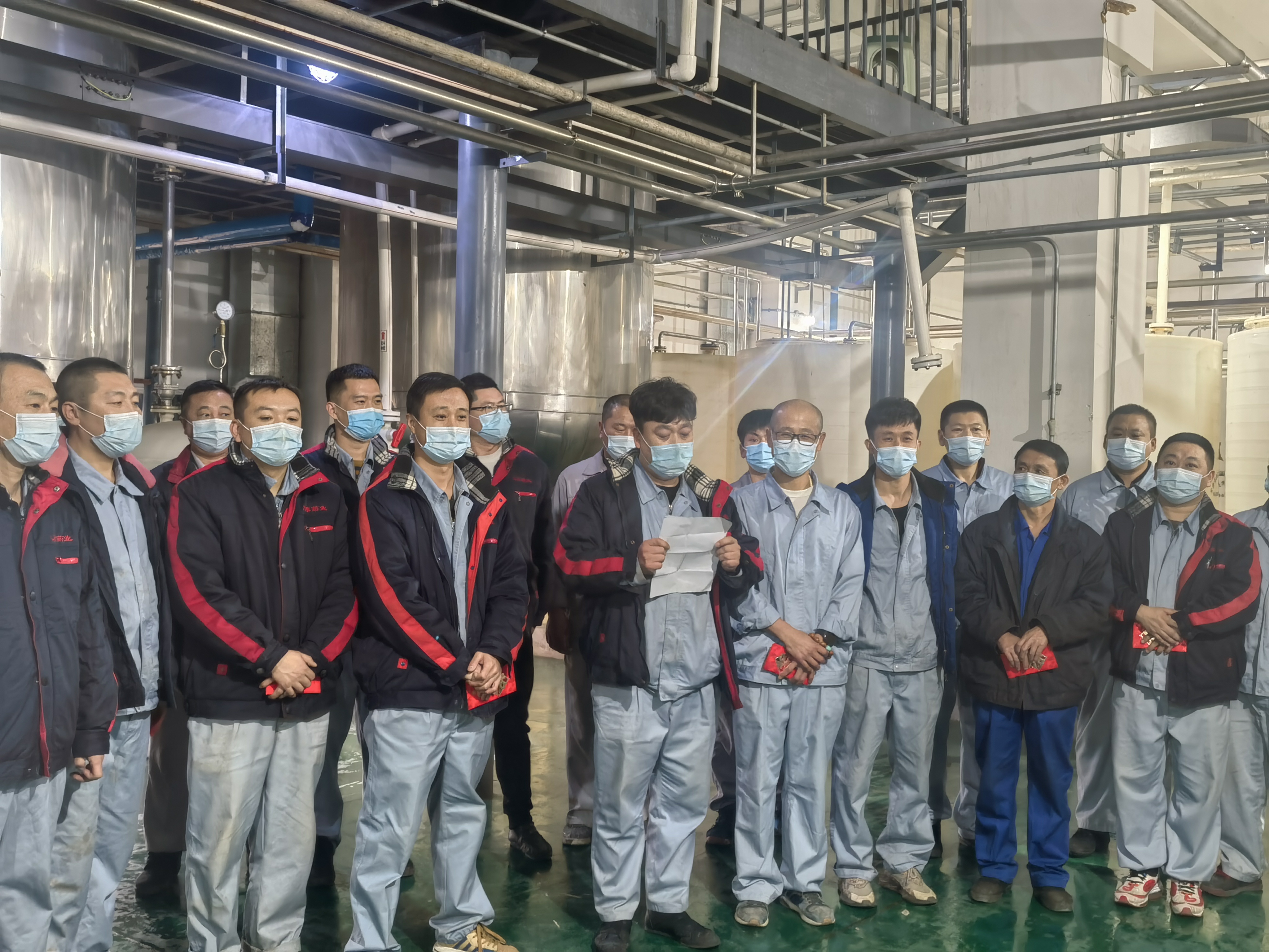 作為保供企業(yè),為了滿足市場(chǎng)藥品需要公司重點(diǎn)供應(yīng)藥品的生產(chǎn)不能停。經(jīng)過(guò)向上級(jí)疫情防控指揮中心申請(qǐng)獲批準(zhǔn)后,公司研究決定,原料生產(chǎn)總監(jiān)劉剛組織下,在鑫泰基副總經(jīng)理劉新華、原料車間副主任馬尚于洋帶領(lǐng)下,原料車間的32名一線員工他們甚至都沒(méi)有時(shí)間來(lái)得及安頓好家人,毫不猶豫的從29日起就開(kāi)始日夜堅(jiān)守在工作崗位上。由于人員有限生產(chǎn)任務(wù)艱巨,他們每個(gè)人的工作量超出平常工作強(qiáng)度,有些員工常常深夜還忙碌在生產(chǎn)崗位上,有時(shí)天還沒(méi)亮,就又開(kāi)始了新一天的工作。白天他們加緊生產(chǎn),晚上睡在潔凈區(qū)、操作間、休息室、辦公室臨時(shí)準(zhǔn)備鋪蓋上,窄小的折疊床上。由于緊張的工作頻率,又不能夠很好的休息很多員工感冒了,但他們沒(méi)有一個(gè)人退縮,沒(méi)有一句怨言,吃著感冒藥、消炎藥崗位上堅(jiān)守了余天保質(zhì)保量完成了生產(chǎn)任務(wù)。